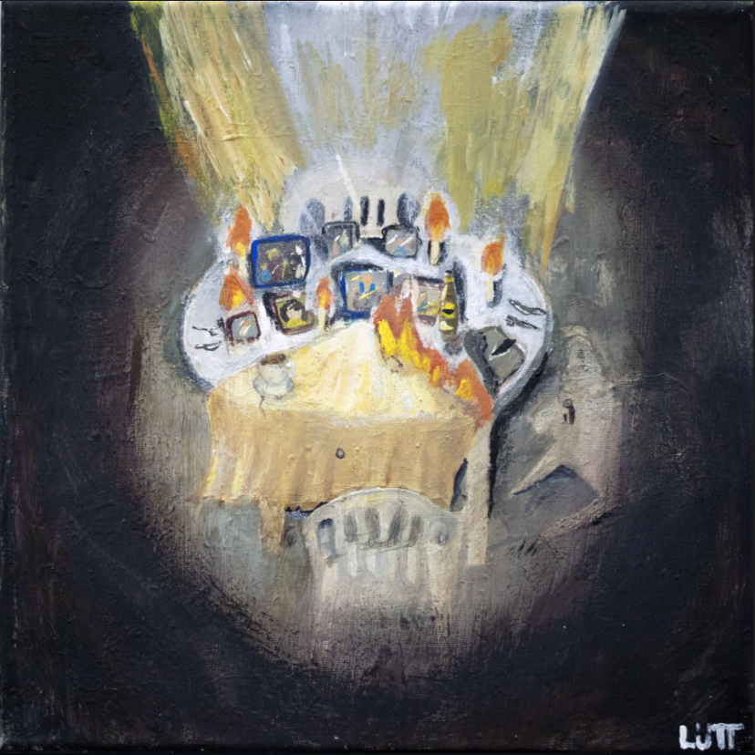 Mi obra presenta una mesa redonda de plástico convertida en un altar improvisado.