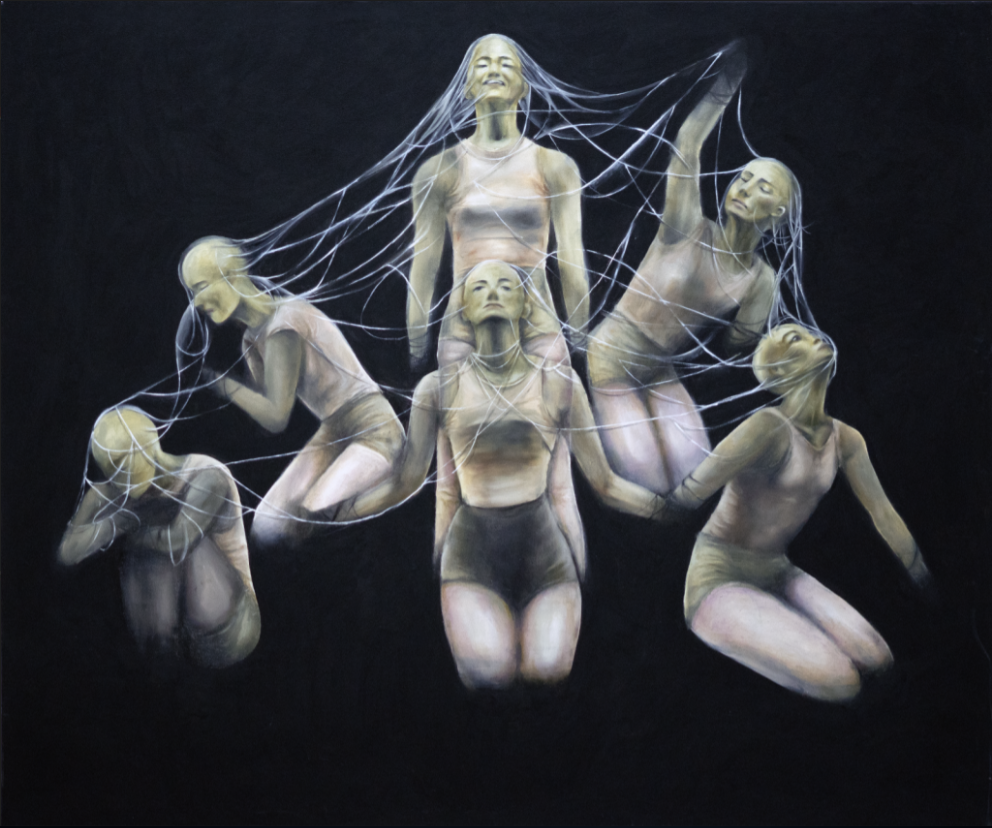 Abajo, tres cuerpos rendidos, vacíos,peso de las caídas que nadie mira. Al centro, dos almas que han
